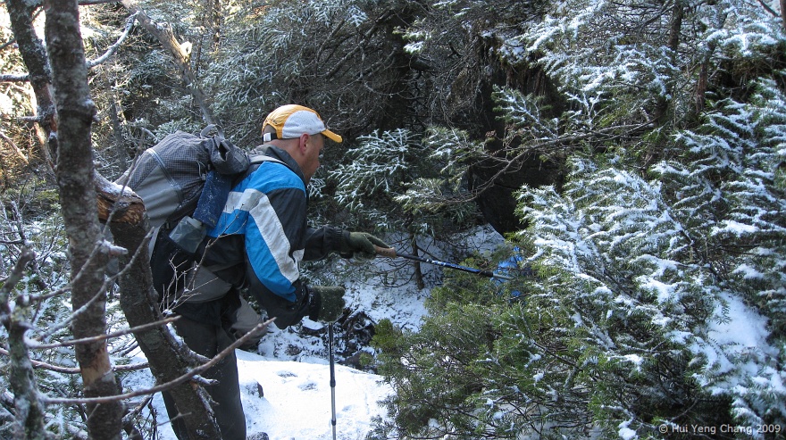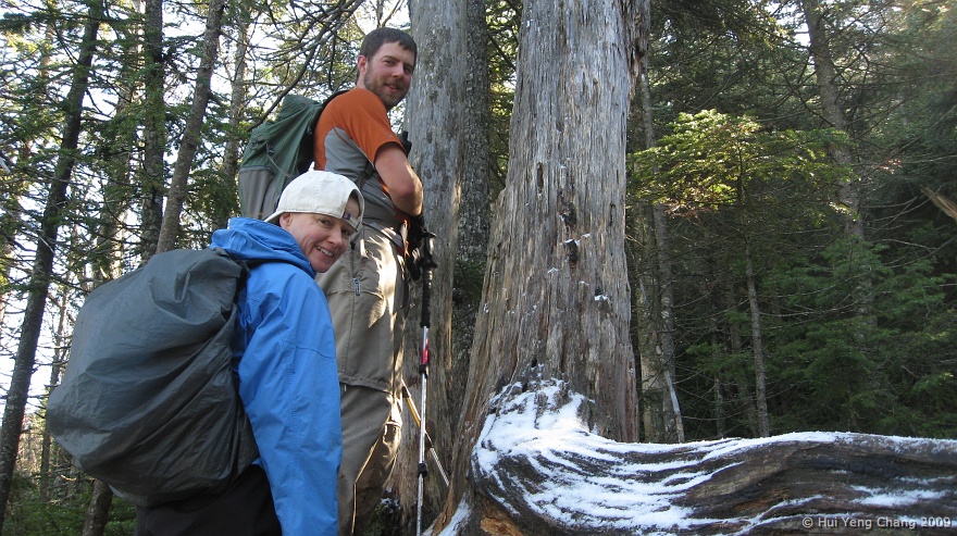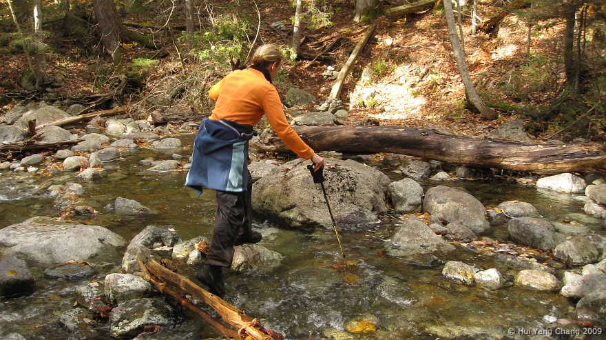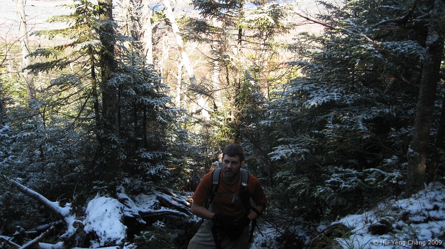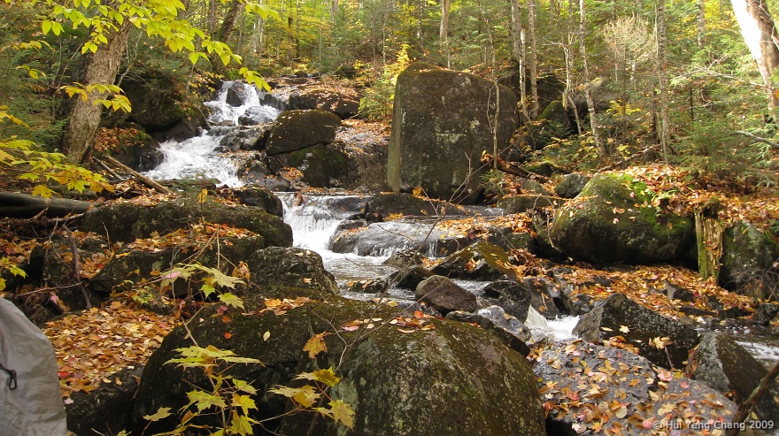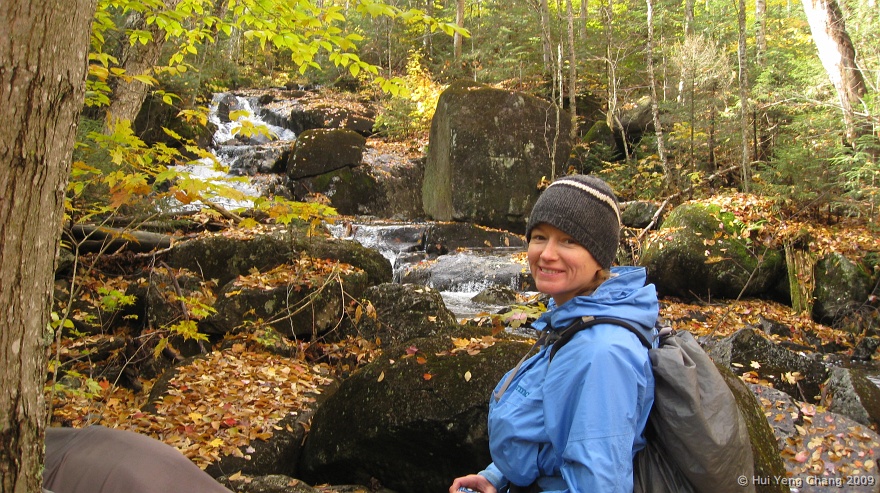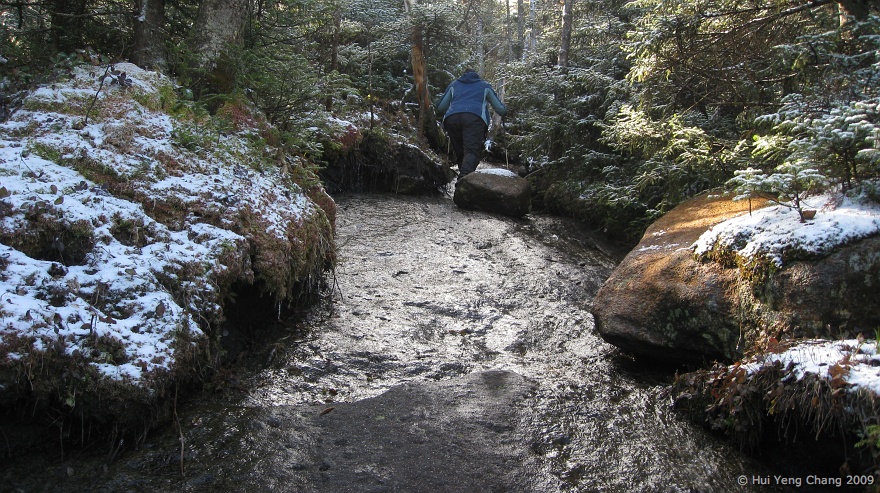 The begining of the trail runs along a brook and it was quite beautiful, but once the trail left the brook, it becomes steeper and we encountered our first sight of snow and ice of the season. My shoes were pretty soaked by the time we got to the summit of Seward. A quick hi and bye to the wooded summit, we made our way to Donaldson. While taking a lunch break at Donladson and enjoying the nice view the summit offers, I began to feel that my core was getting cold, and the wet feet just added to another factor for me to decide not to go to Emmons, the last and viewless summit on the range. Kim joined me in the decision and we came down via Calkins Brook trail, added few more miles to the hike, but it was well worth it.