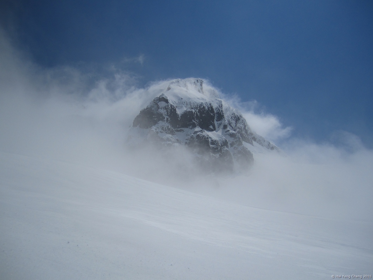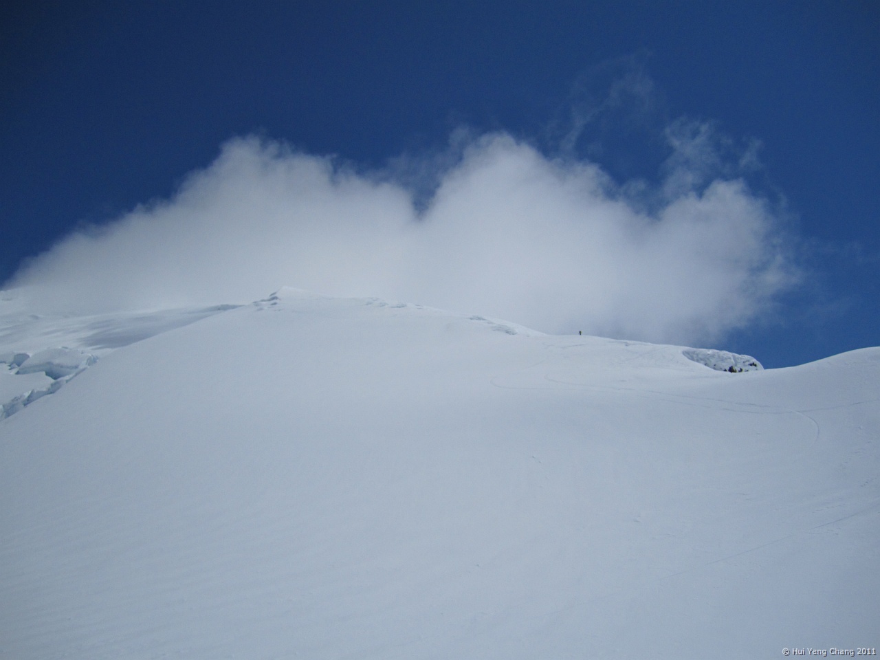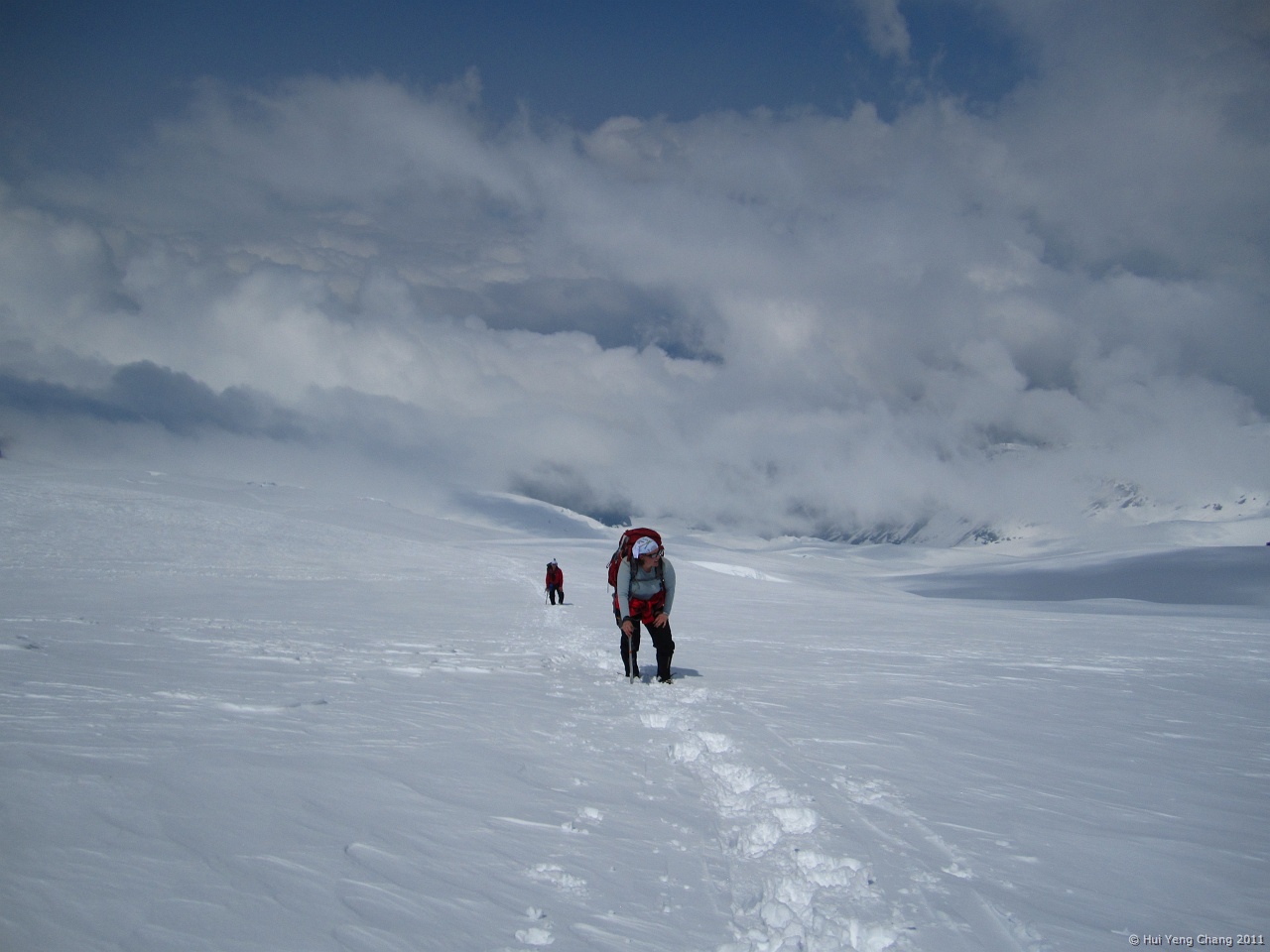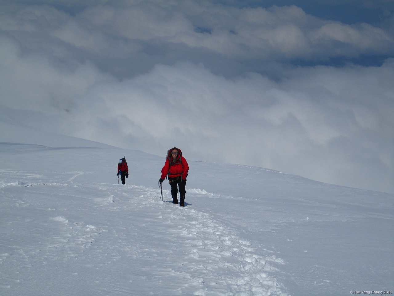 Anyway, so all four of us made it to the summit together, and Lei arrived shortly after! The climb back to the camp was a morale bashing, spirit crushing experience. We're clouded in as soon as we climbed below the saddle, with almost whiteout conditions and freaking postholing on every step we took, we slogged and cursed our way back to the camp around 8 PM. Thanks to Kim, who had been busy melting snow for us, we had plenty of water to rehydrate.