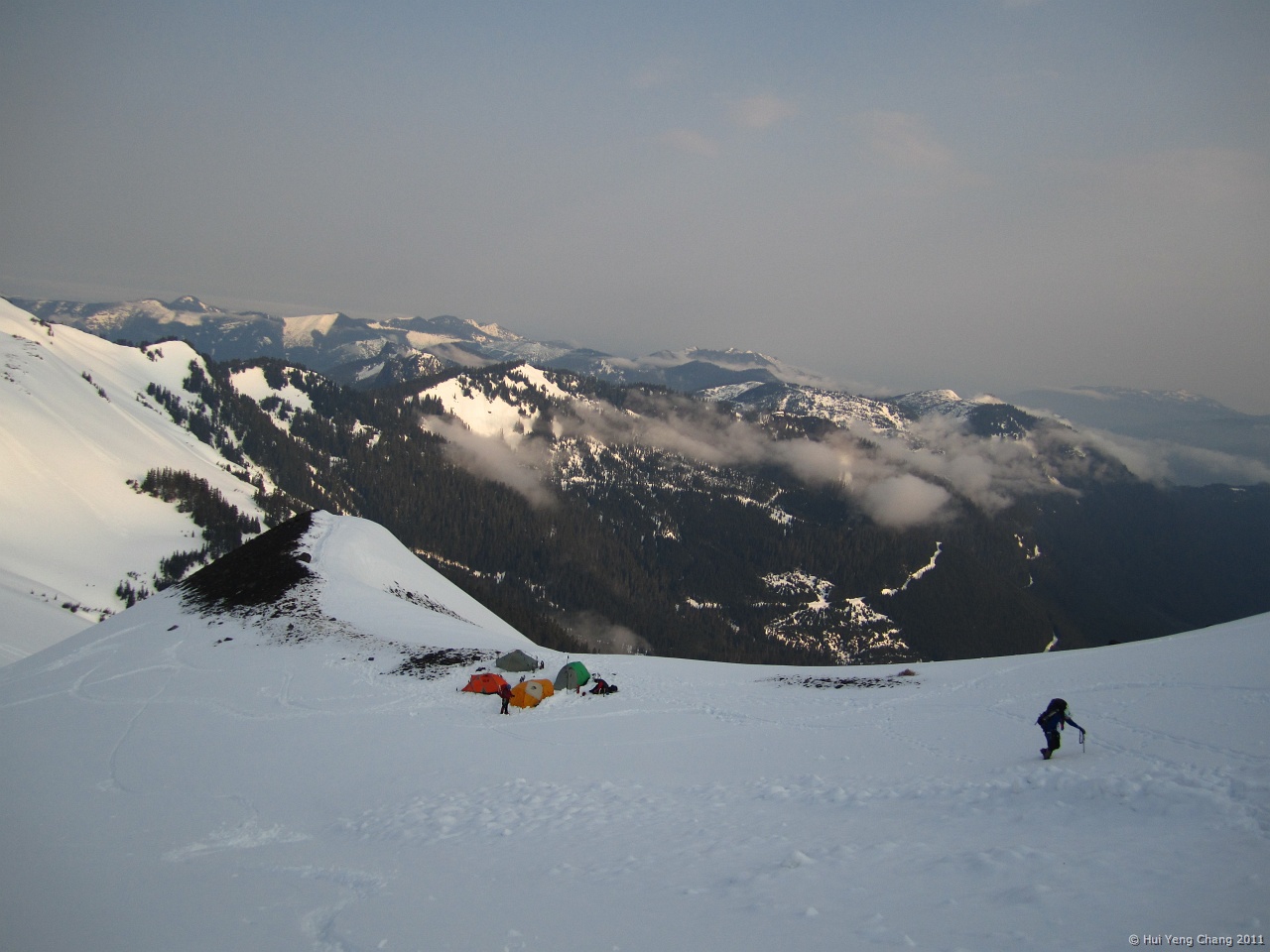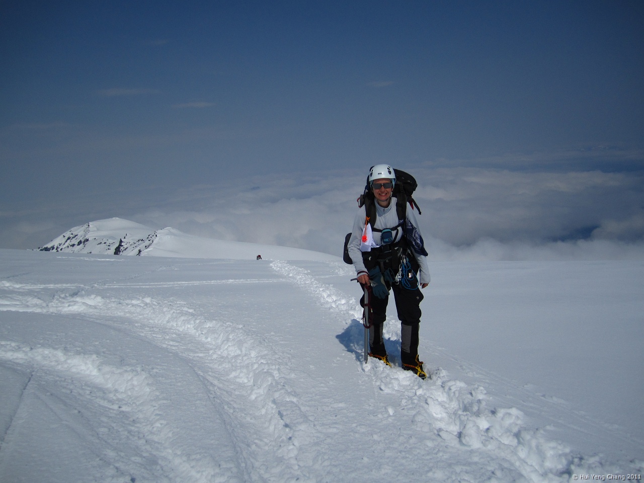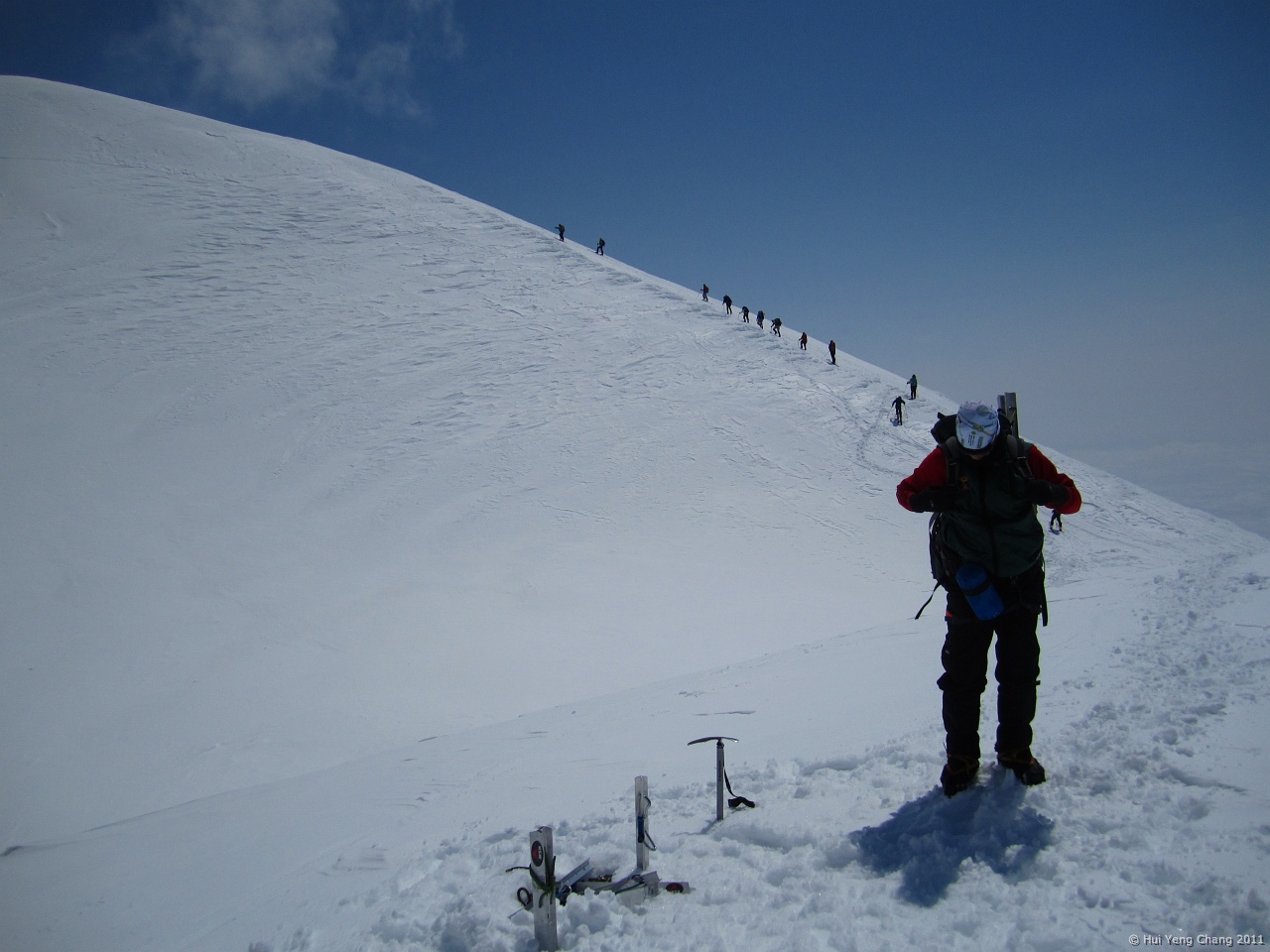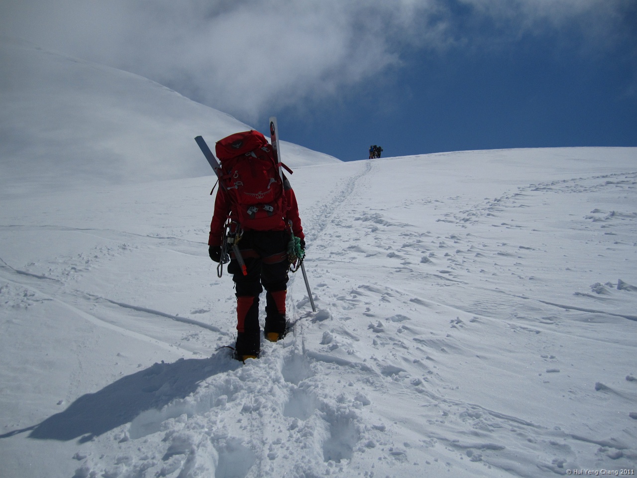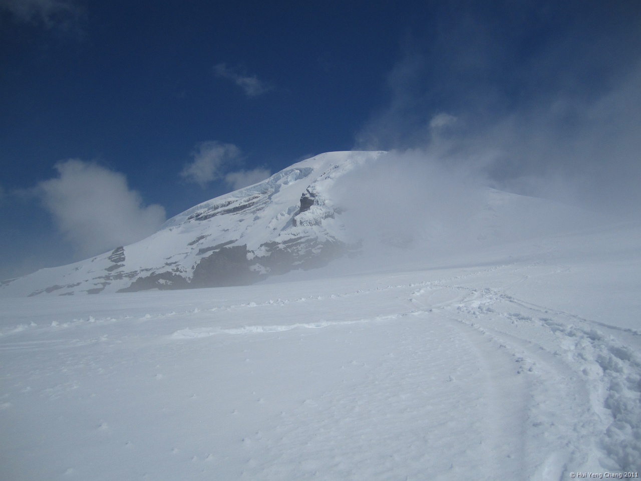 Anyway, so all four of us made it to the summit together, and Lei arrived shortly after! The climb back to the camp was a morale bashing, spirit crushing experience. We're clouded in as soon as we climbed below the saddle, with almost whiteout conditions and freaking postholing on every step we took, we slogged and cursed our way back to the camp around 8 PM. Thanks to Kim, who had been busy melting snow for us, we had plenty of water to rehydrate.