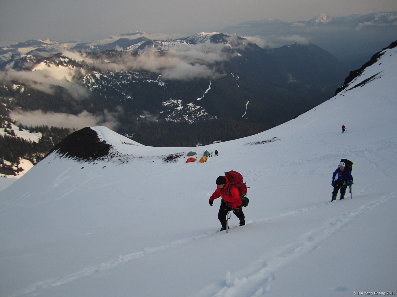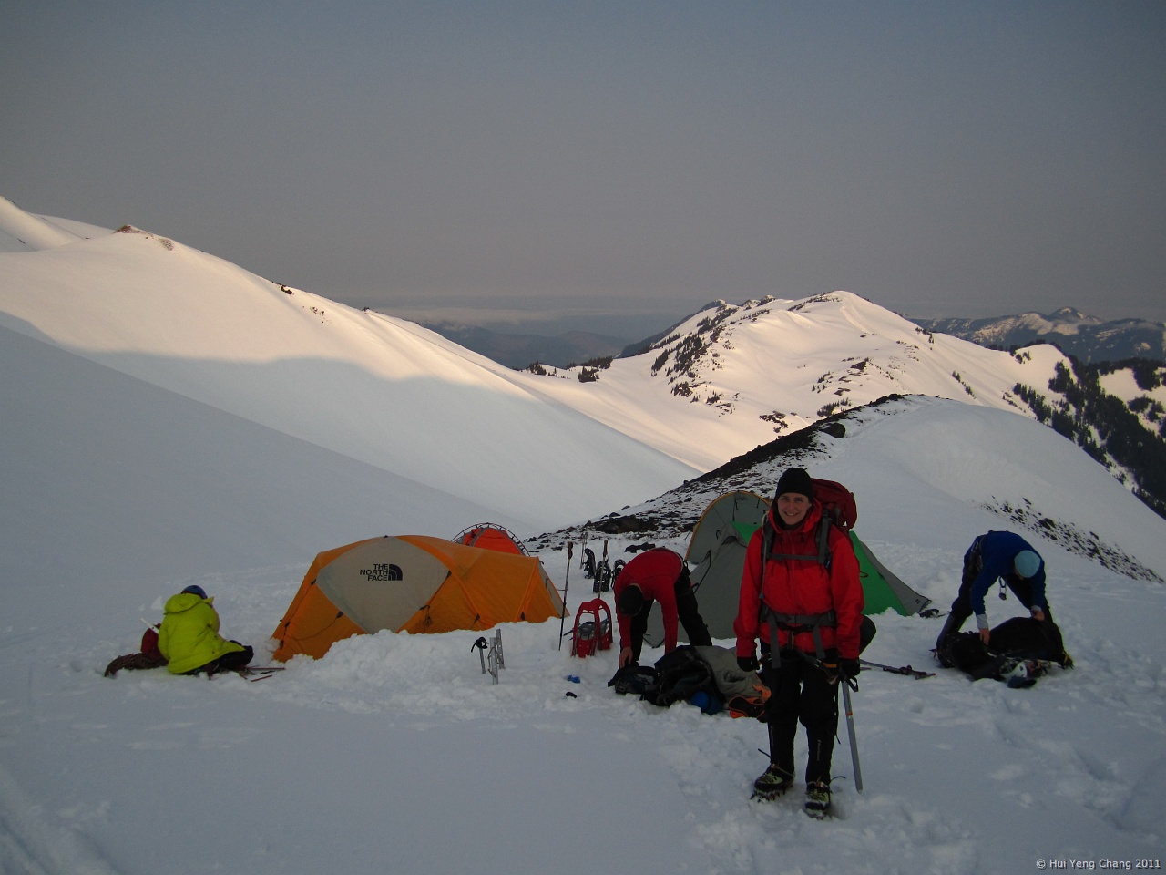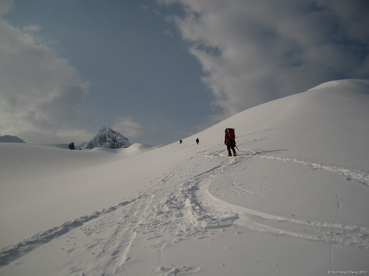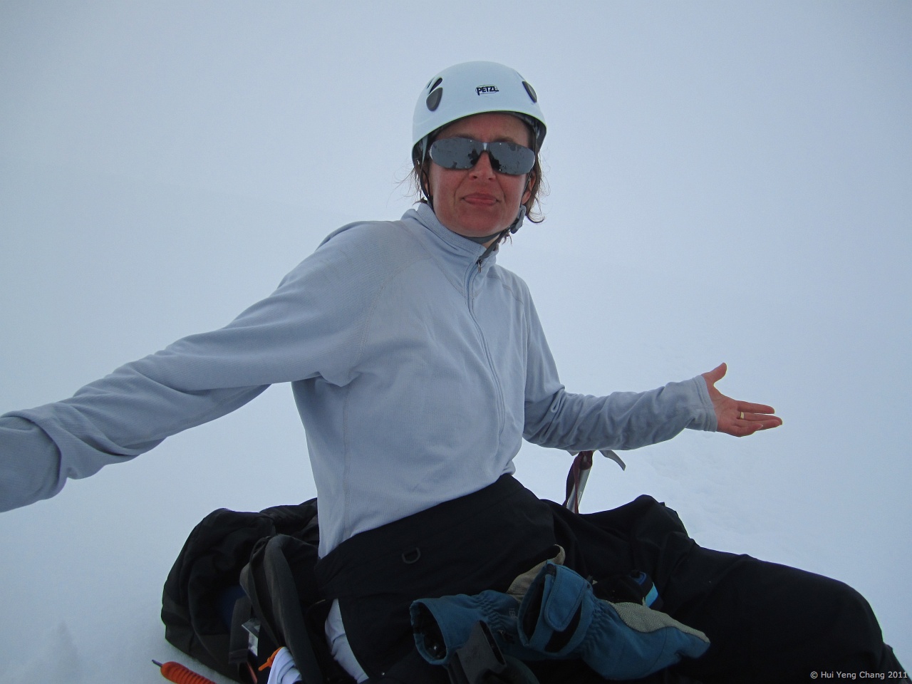 Anyway, so all four of us made it to the summit together, and Lei arrived shortly after! The climb back to the camp was a morale bashing, spirit crushing experience. We're clouded in as soon as we climbed below the saddle, with almost whiteout conditions and freaking postholing on every step we took, we slogged and cursed our way back to the camp around 8 PM. Thanks to Kim, who had been busy melting snow for us, we had plenty of water to rehydrate.