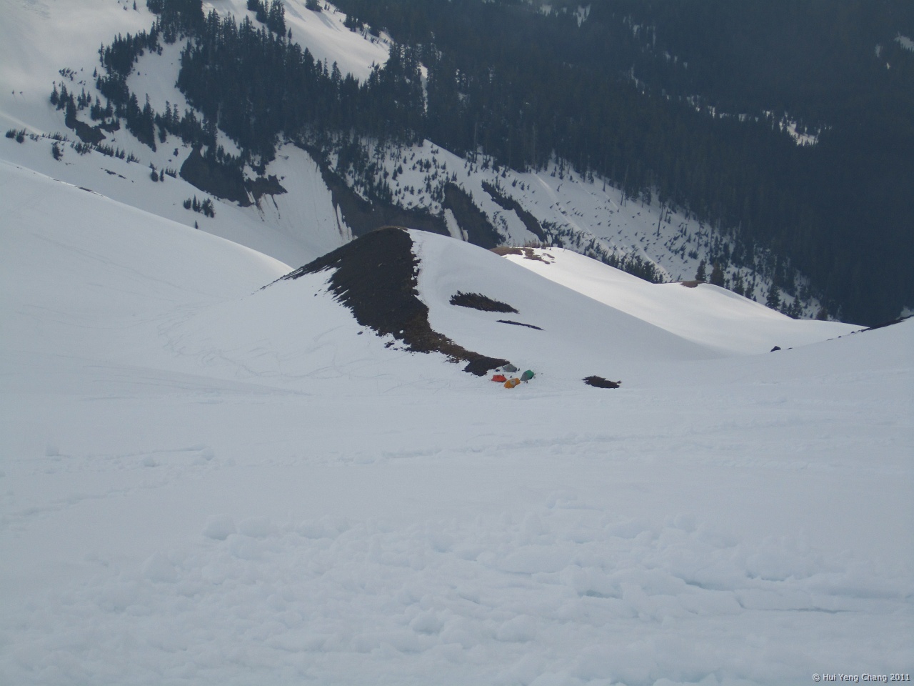 We hiked out the next morning under lightly drizzling sky. Glissaded wherever we could, made the descend faster and wicked fun! On a slope we saw remnant of a fresh avalanche, Jen thought it was trigger by skiers. It was a weird looking sight, like a big snow balls field, it made for a bumpy glissading ride.