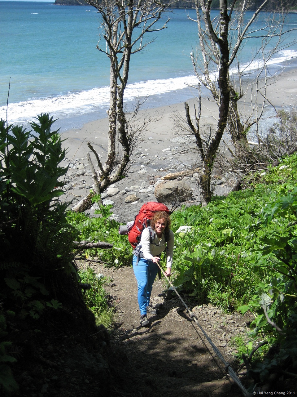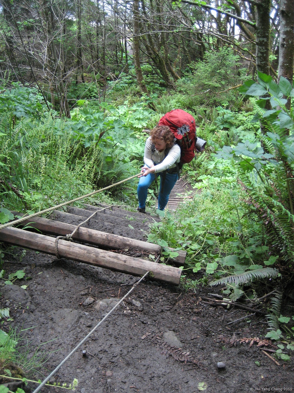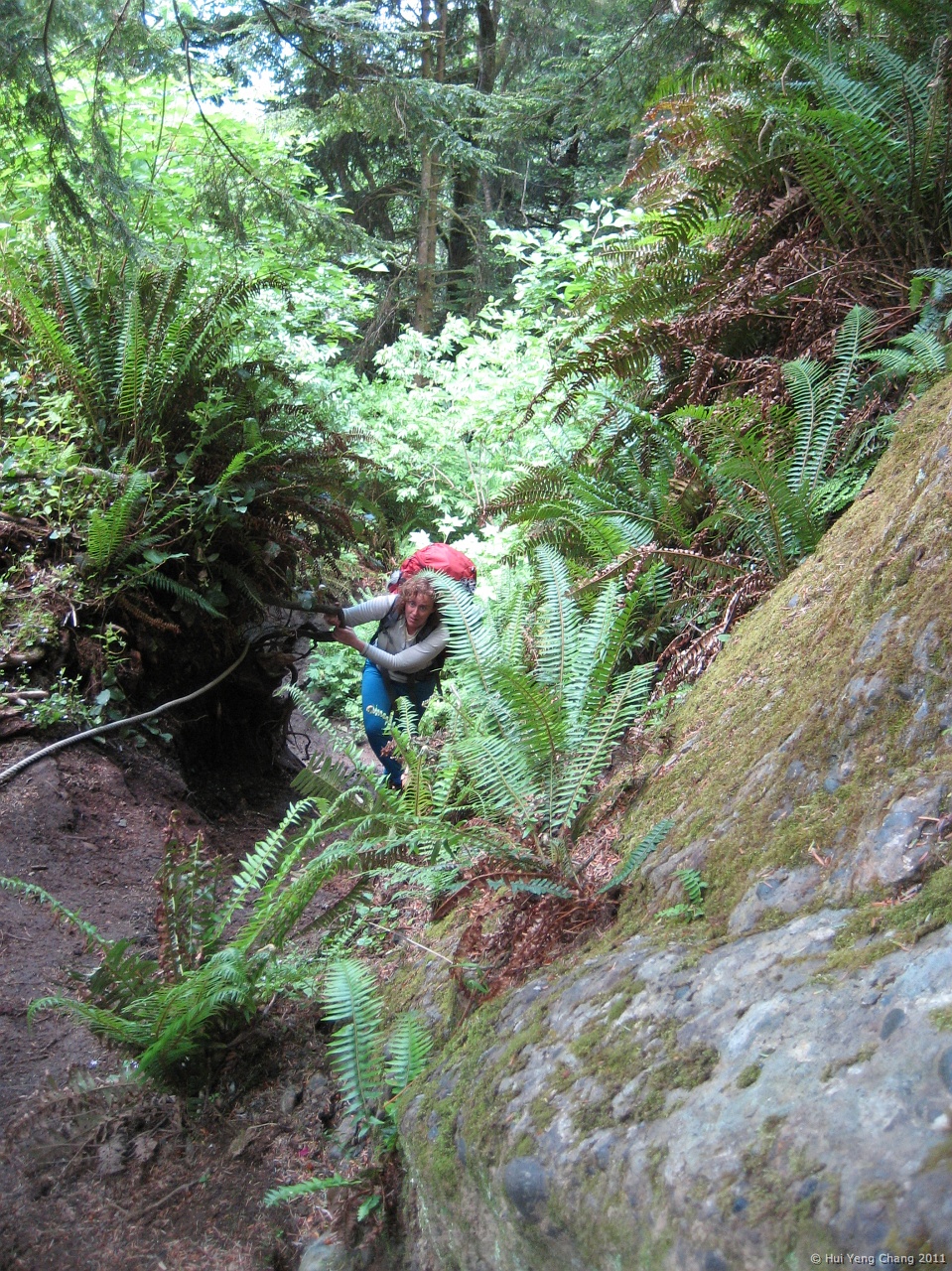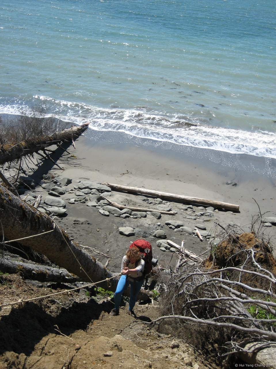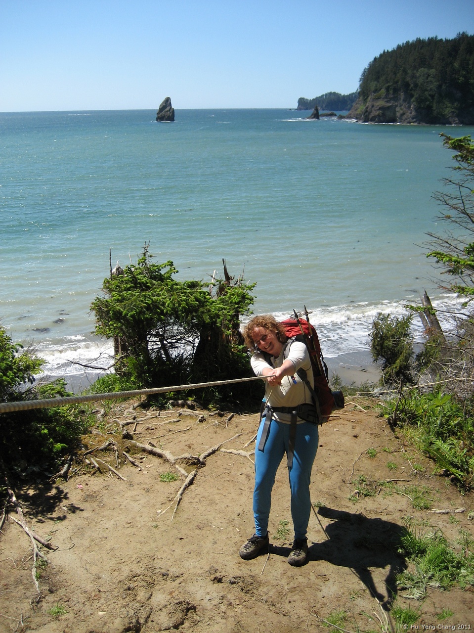 Backpacking along the coastline turned out to have a different kind of challenge. The trail from the parking lot led us through a lush wooded terrain. Once we reached the coast, the trail went down to the beach where pile of drift woods gathered. From the beach, we had to watch for a large disc that marked the beginning of upland trail. The tide was coming in as we're hiking along the coastline, as the beach get narrower and narrower, I was worried that we might miss the sign. Just when the we're about to run out of dry land under our feet, I saw the disc, and a sad looking rope leading up to a slope. That was the begining of a series of fun rope climbs. Turned out rope ladders were mostly just ropes no ladders.