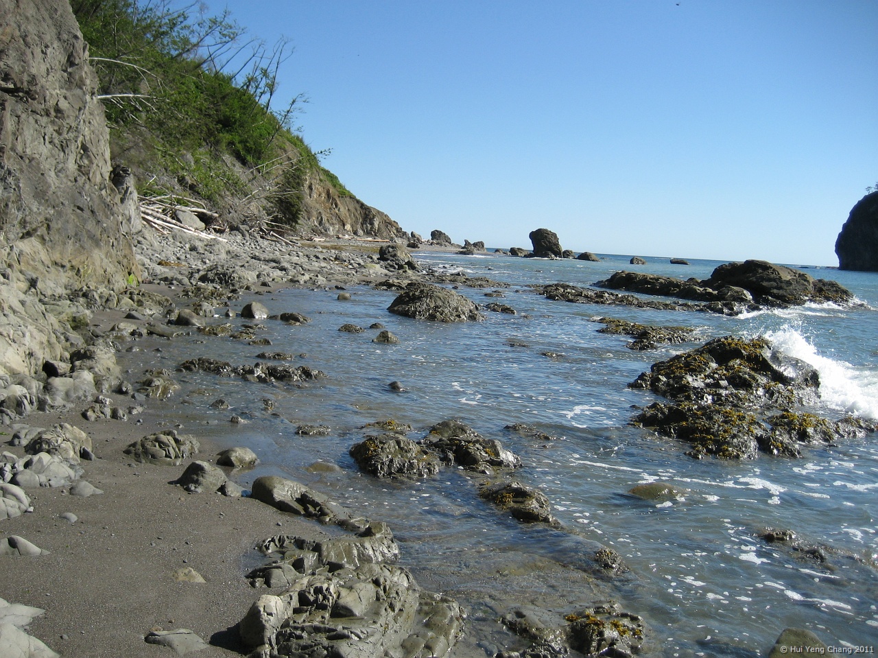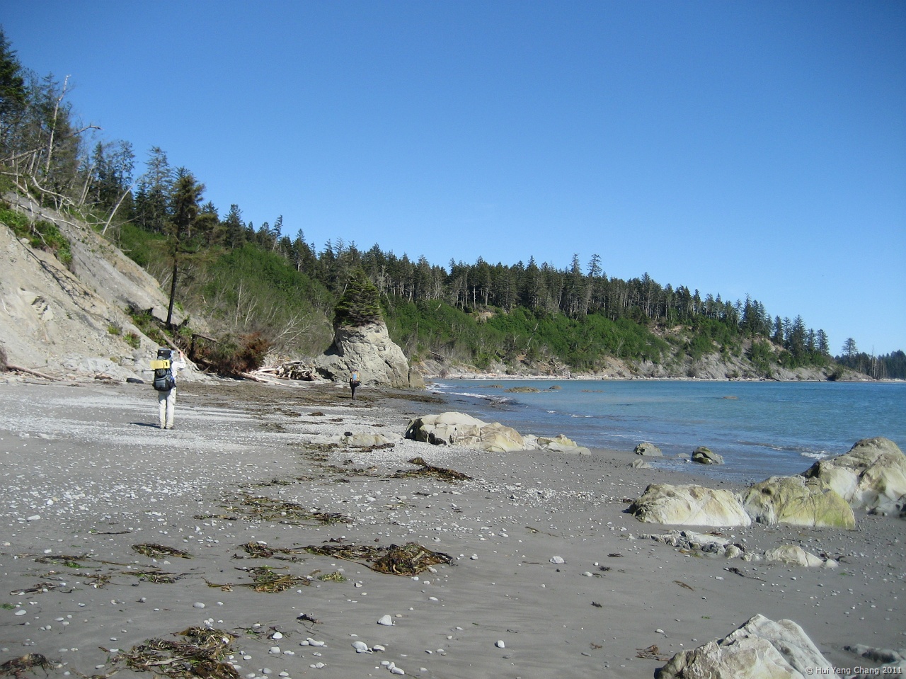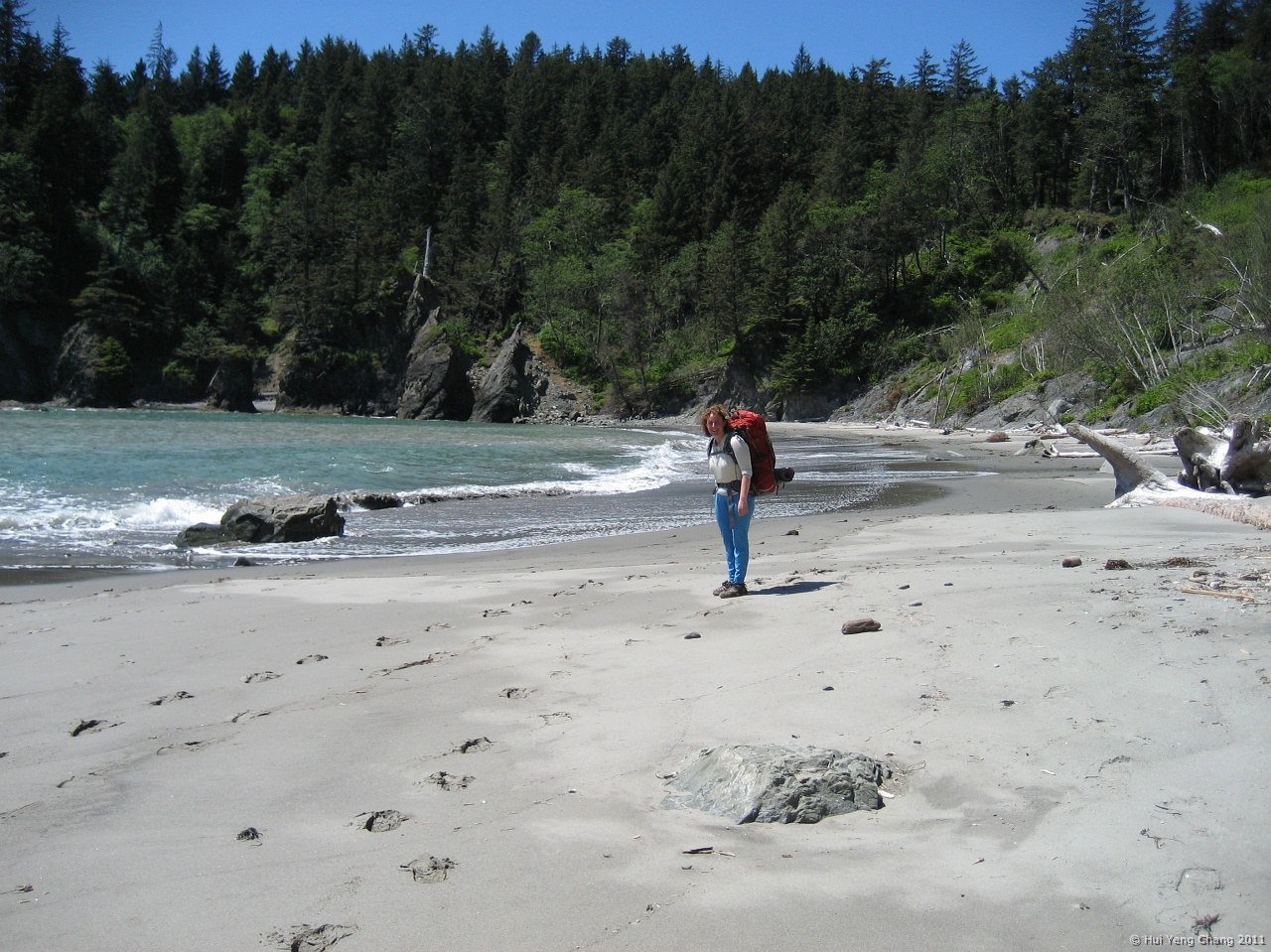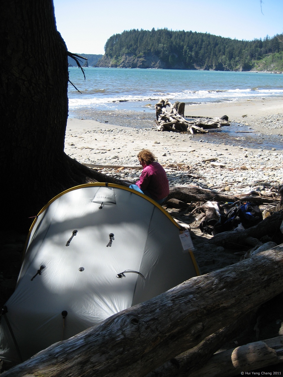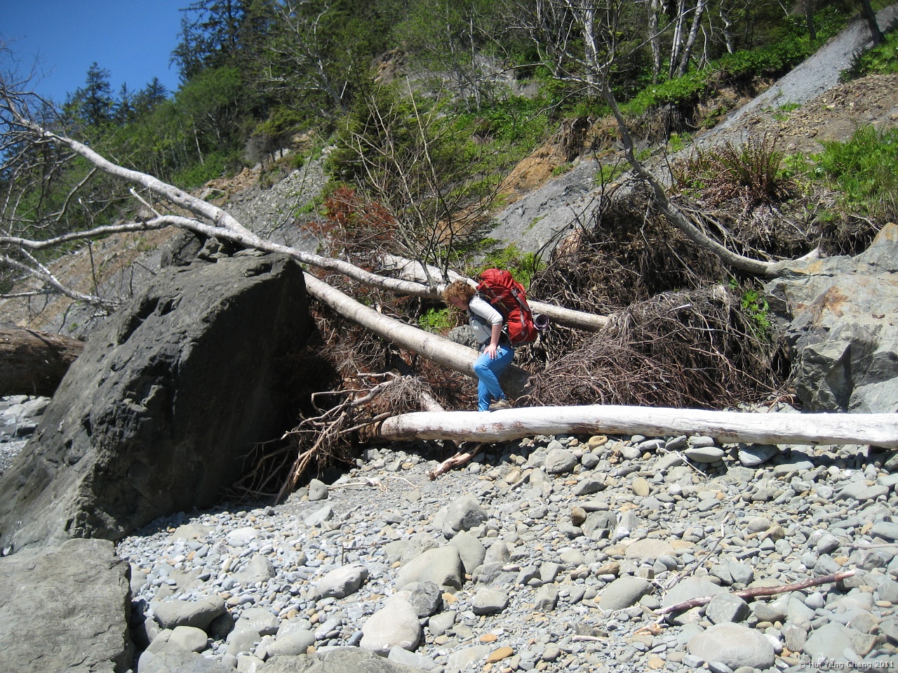 Backpacking along the coastline turned out to have a different kind of challenge. The trail from the parking lot led us through a lush wooded terrain. Once we reached the coast, the trail went down to the beach where pile of drift woods gathered. From the beach, we had to watch for a large disc that marked the beginning of upland trail. The tide was coming in as we're hiking along the coastline, as the beach get narrower and narrower, I was worried that we might miss the sign. Just when the we're about to run out of dry land under our feet, I saw the disc, and a sad looking rope leading up to a slope. That was the begining of a series of fun rope climbs. Turned out rope ladders were mostly just ropes no ladders.