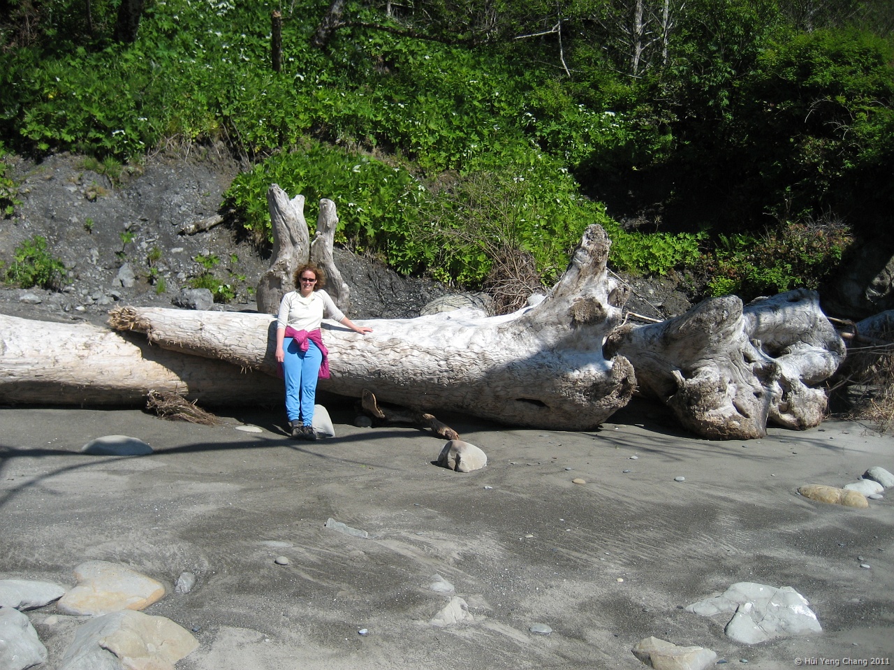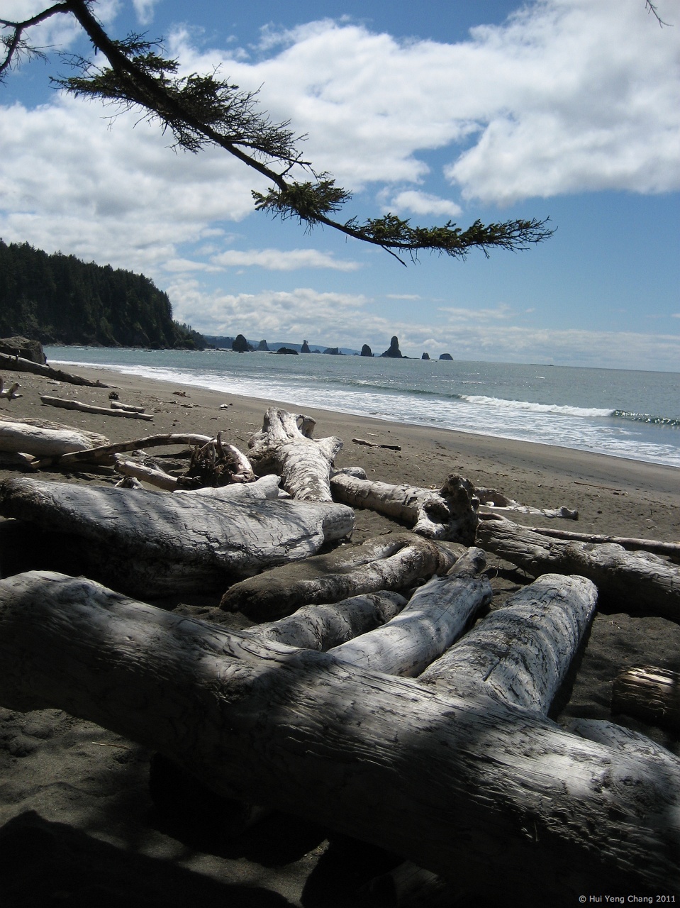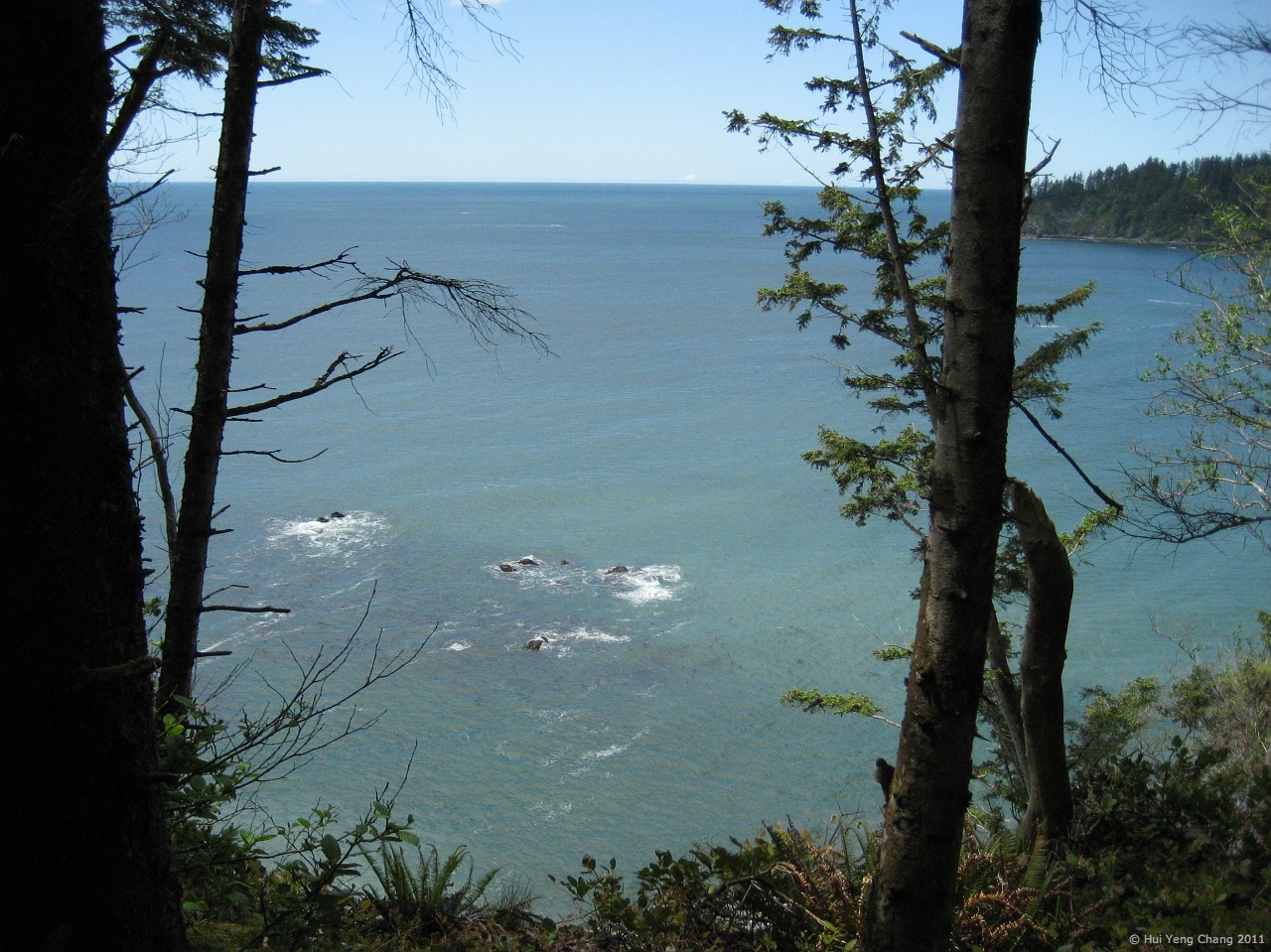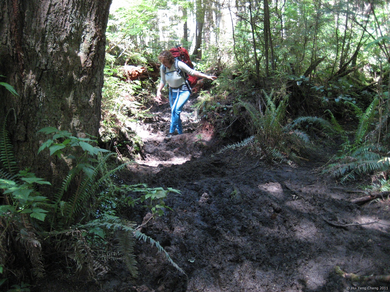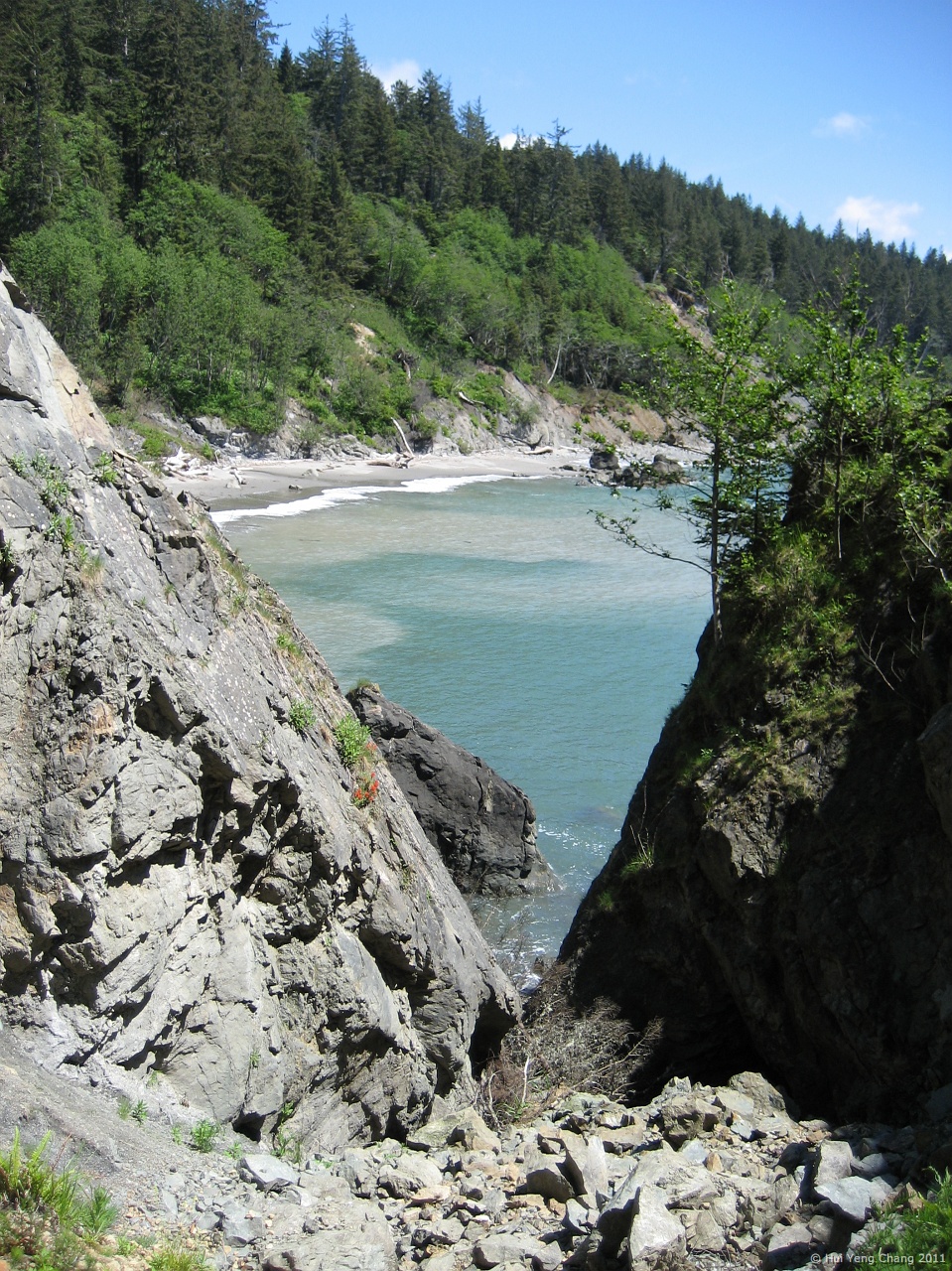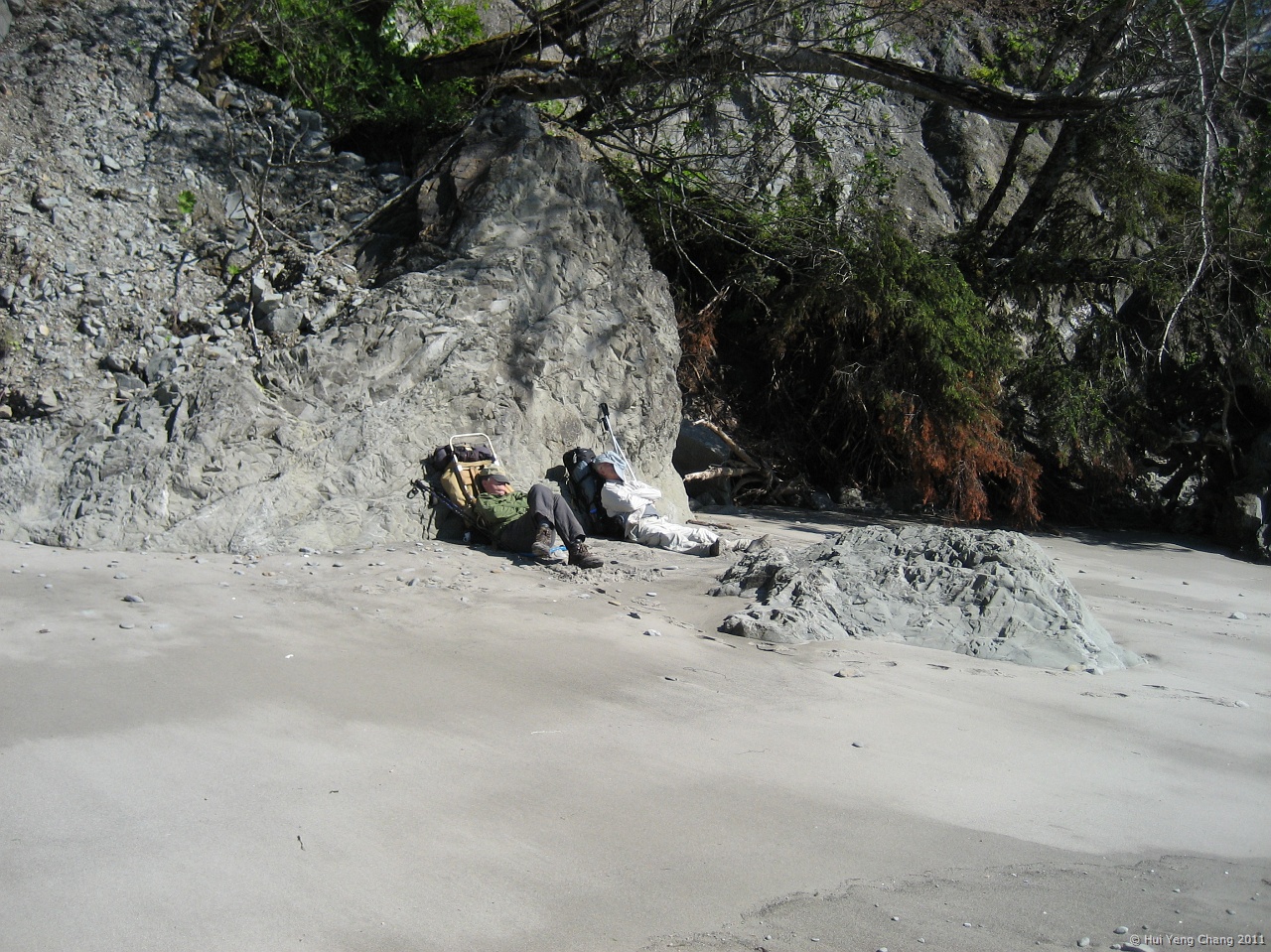 Backpacking along the coastline turned out to have a different kind of challenge. The trail from the parking lot led us through a lush wooded terrain. Once we reached the coast, the trail went down to the beach where pile of drift woods gathered. From the beach, we had to watch for a large disc that marked the beginning of upland trail. The tide was coming in as we're hiking along the coastline, as the beach get narrower and narrower, I was worried that we might miss the sign. Just when the we're about to run out of dry land under our feet, I saw the disc, and a sad looking rope leading up to a slope. That was the begining of a series of fun rope climbs. Turned out rope ladders were mostly just ropes no ladders.