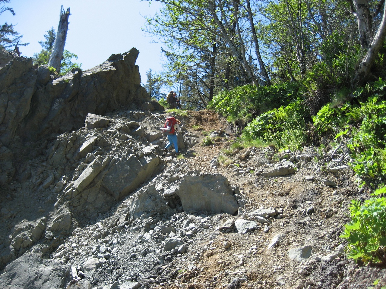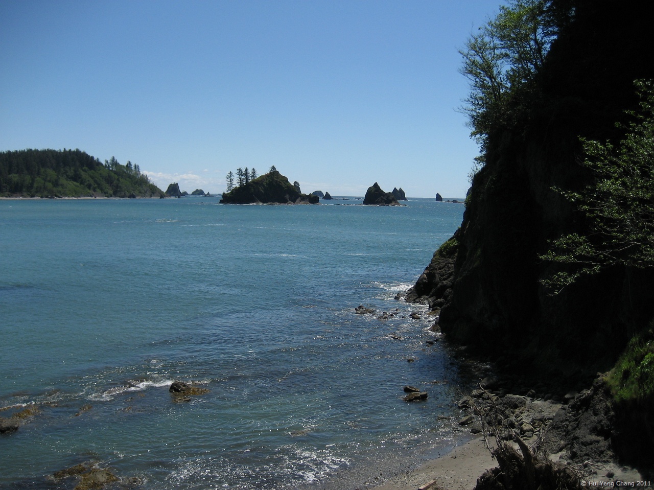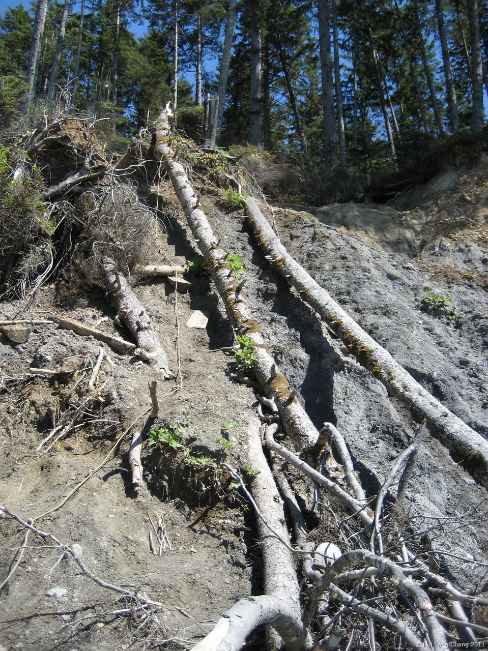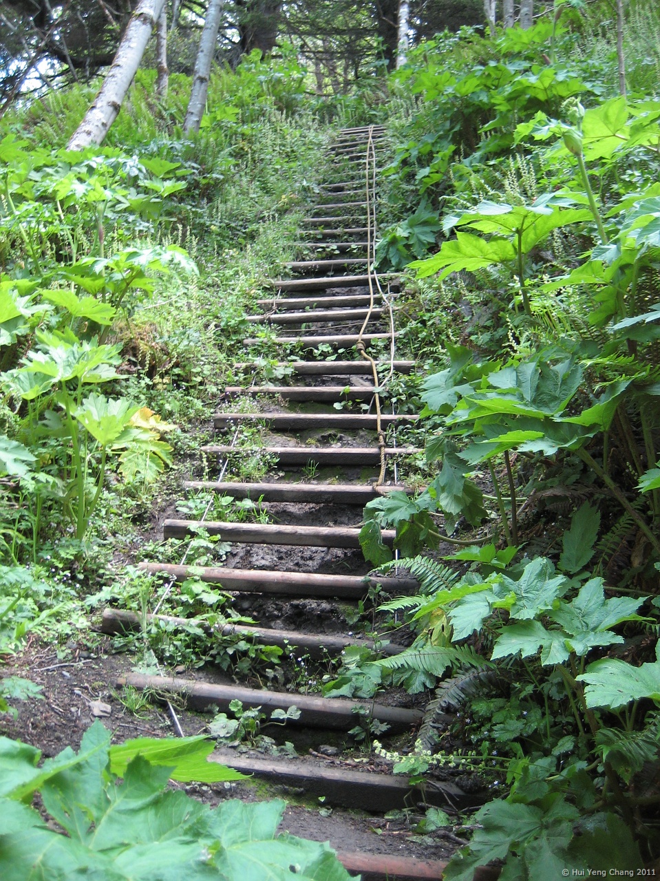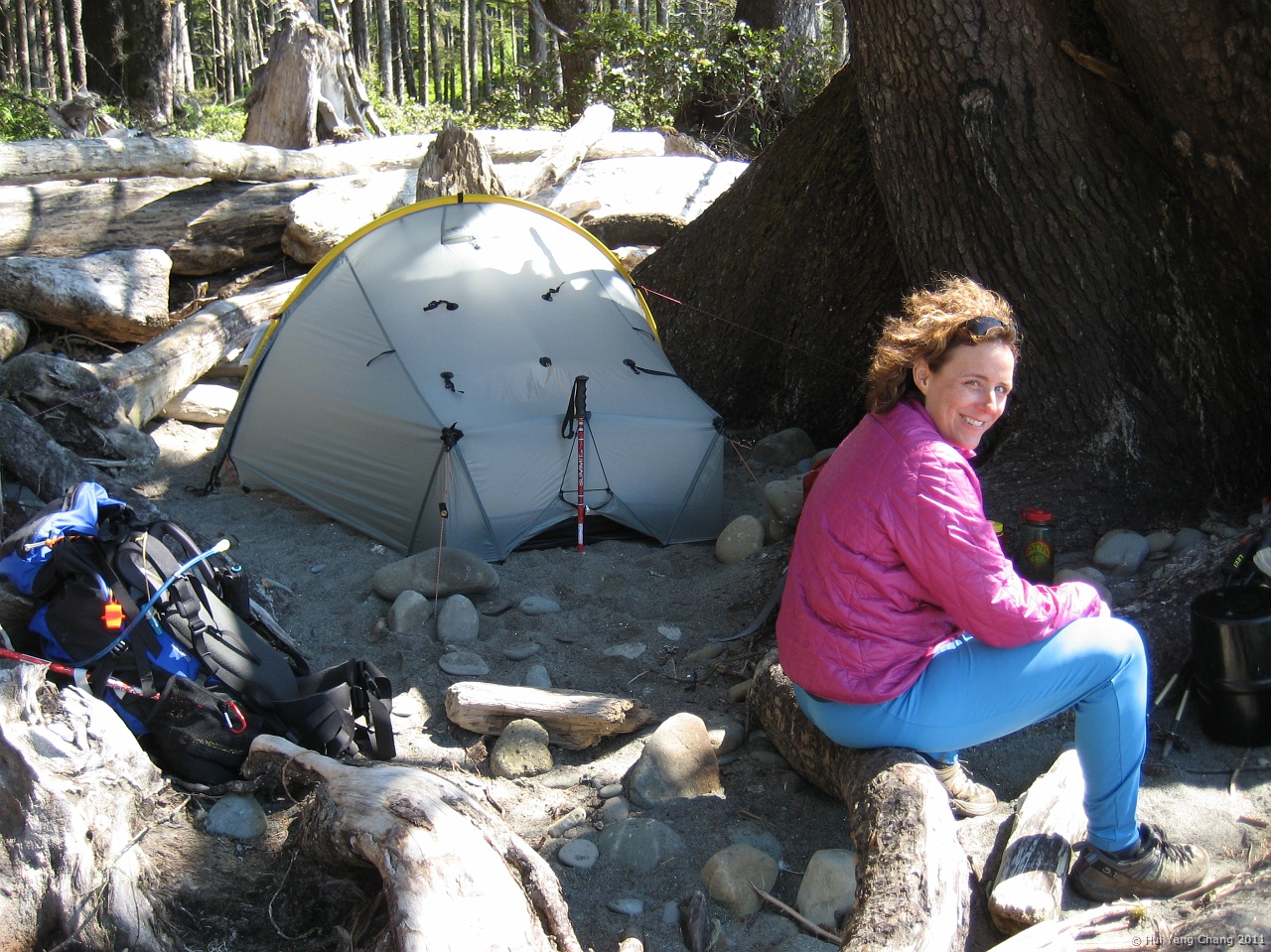 Backpacking along the coastline turned out to have a different kind of challenge. The trail from the parking lot led us through a lush wooded terrain. Once we reached the coast, the trail went down to the beach where pile of drift woods gathered. From the beach, we had to watch for a large disc that marked the beginning of upland trail. The tide was coming in as we're hiking along the coastline, as the beach get narrower and narrower, I was worried that we might miss the sign. Just when the we're about to run out of dry land under our feet, I saw the disc, and a sad looking rope leading up to a slope. That was the begining of a series of fun rope climbs. Turned out rope ladders were mostly just ropes no ladders.