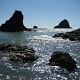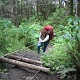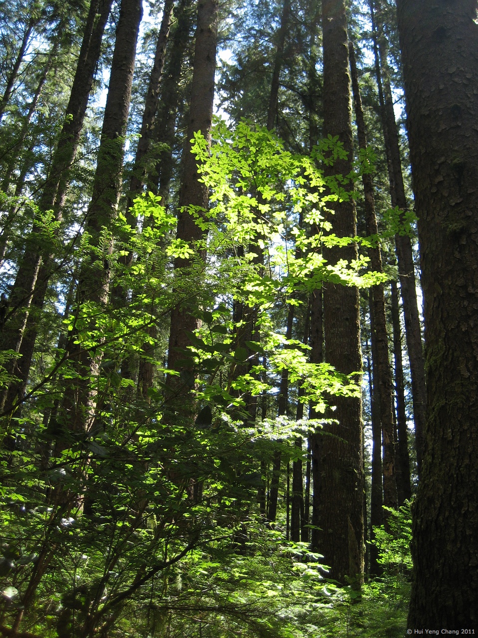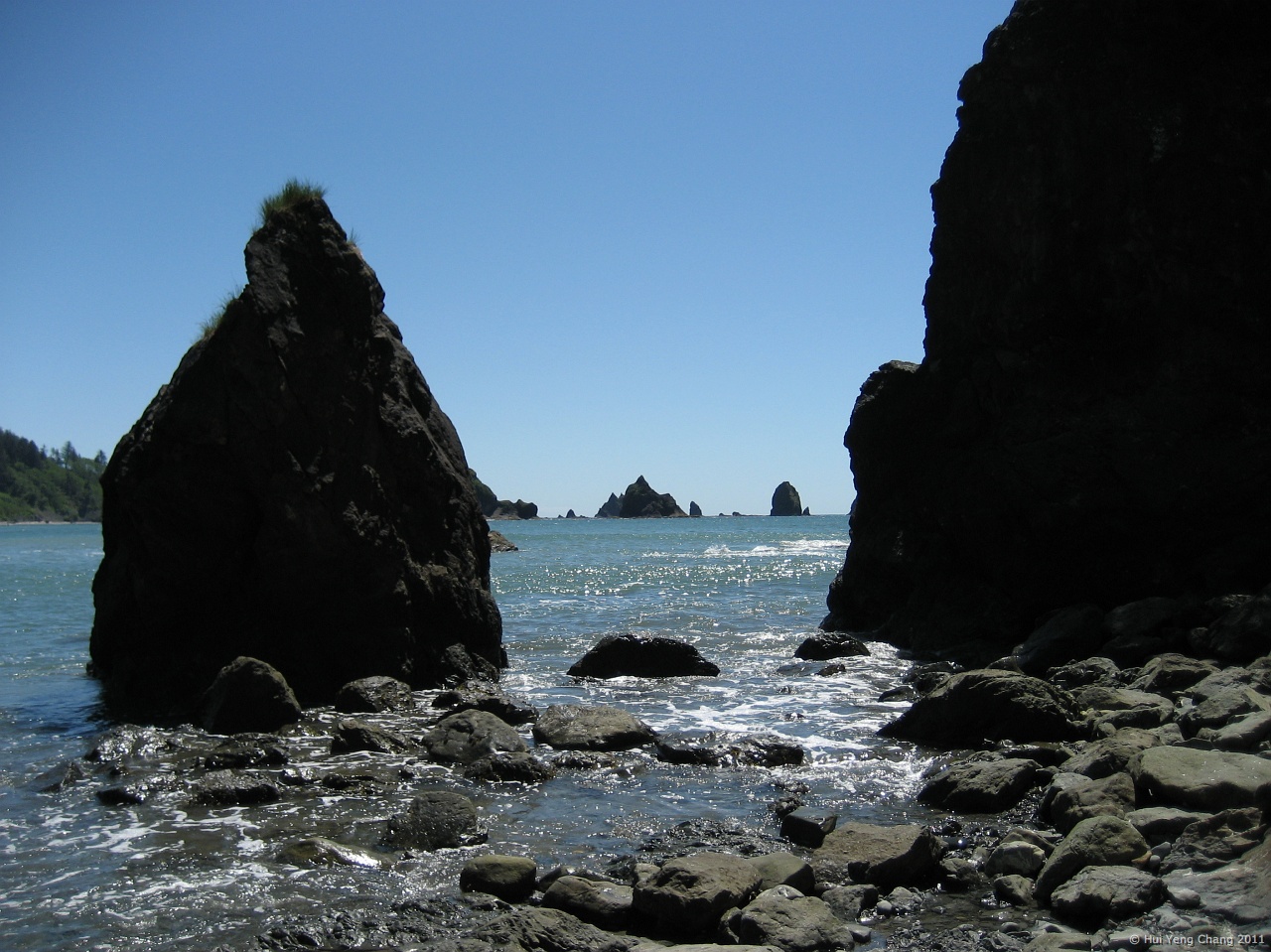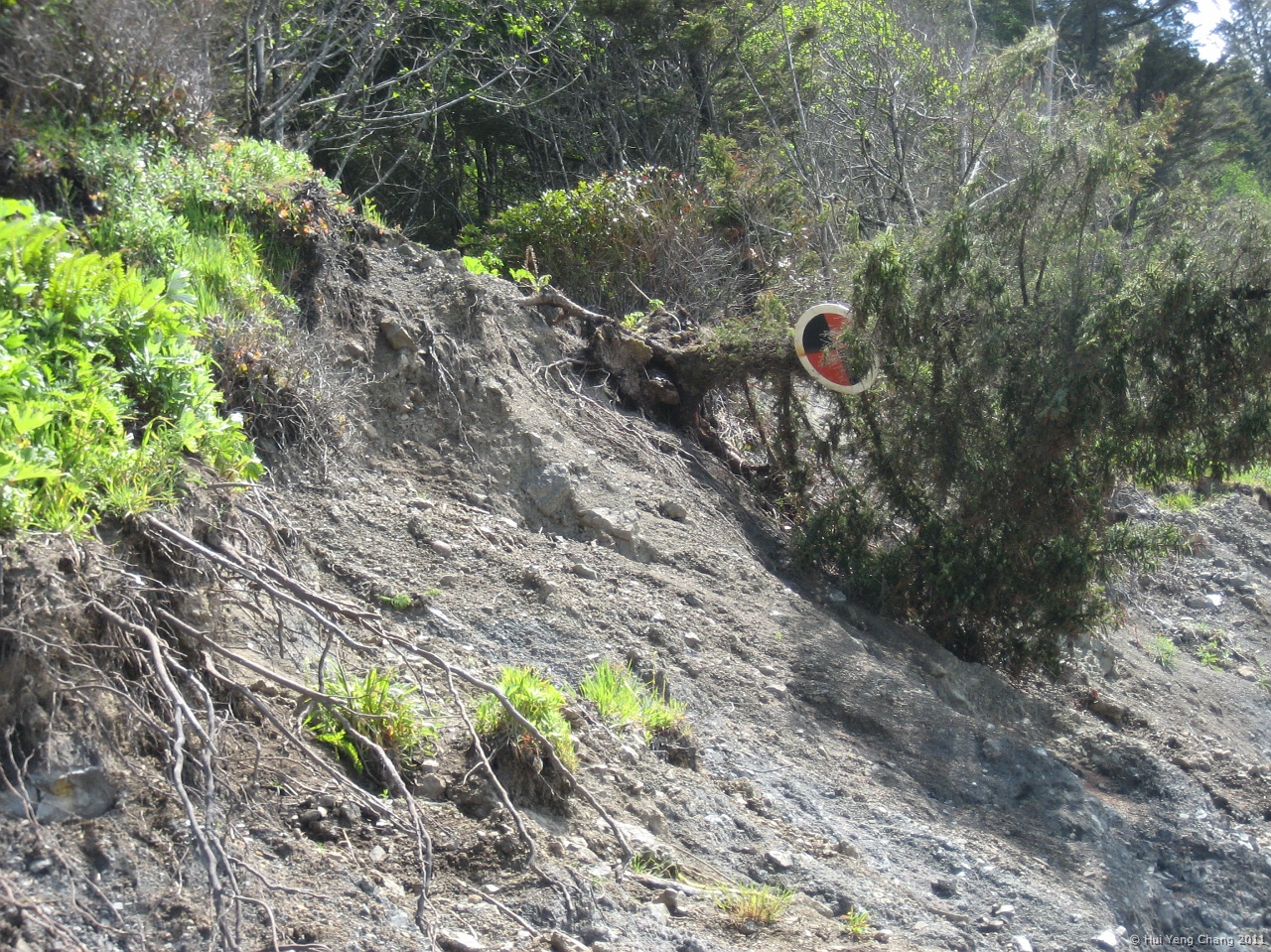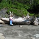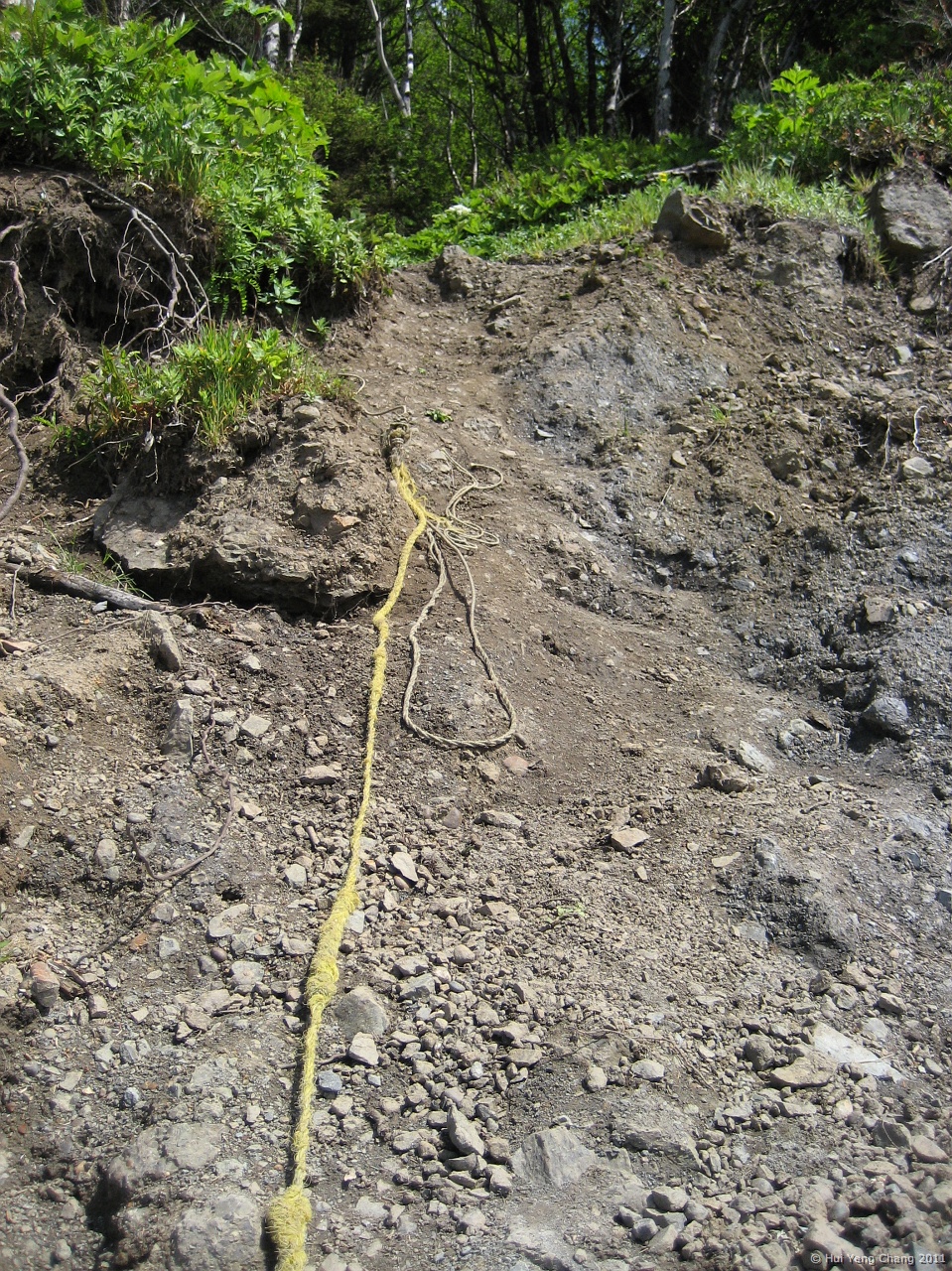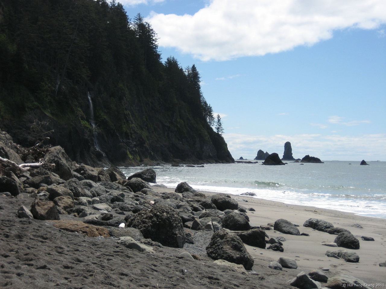 Backpacking along the coastline turned out to have a different kind of challenge. The trail from the parking lot led us through a lush wooded terrain. Once we reached the coast, the trail went down to the beach where pile of drift woods gathered. From the beach, we had to watch for a large disc that marked the beginning of upland trail. The tide was coming in as we're hiking along the coastline, as the beach get narrower and narrower, I was worried that we might miss the sign. Just when the we're about to run out of dry land under our feet, I saw the disc, and a sad looking rope leading up to a slope. That was the begining of a series of fun rope climbs. Turned out rope ladders were mostly just ropes no ladders.