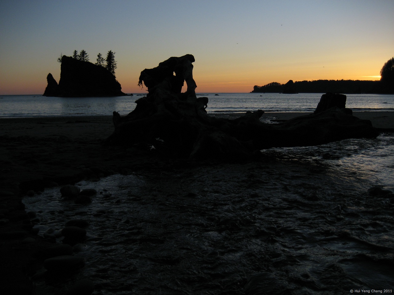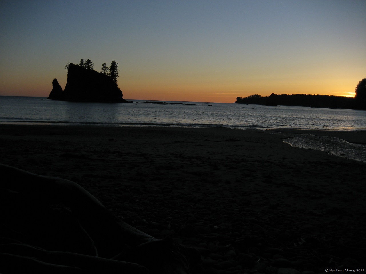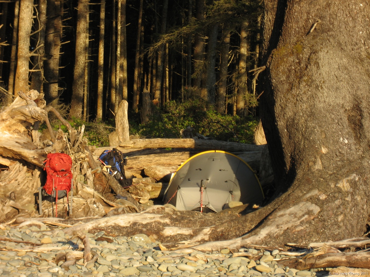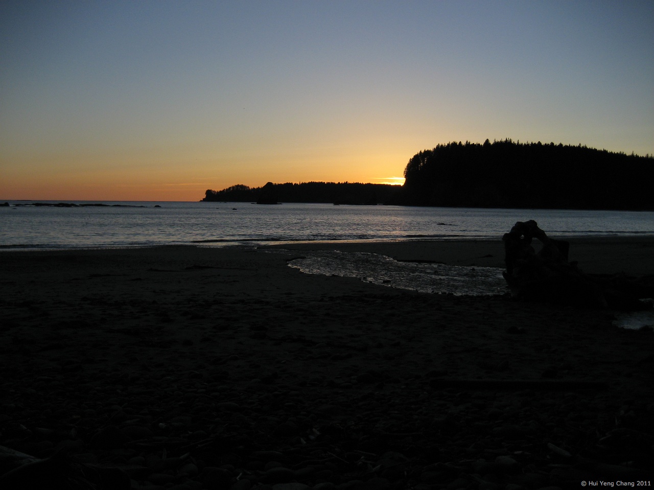 On the way back, few smaller tidal pools had formed, we looked for star fish but was fruitless. Instead there were many sea anemone, and bald eagles gliding above us. Once got back to "our" beach, we gathered wood, made fire ring thinking that we'll have a nice fire tonight, but the darkness never came. We sat around, cooked dinner and watch sunset on the beach. Around ten o'clock when we headed into the tent, it was still pretty bright out.