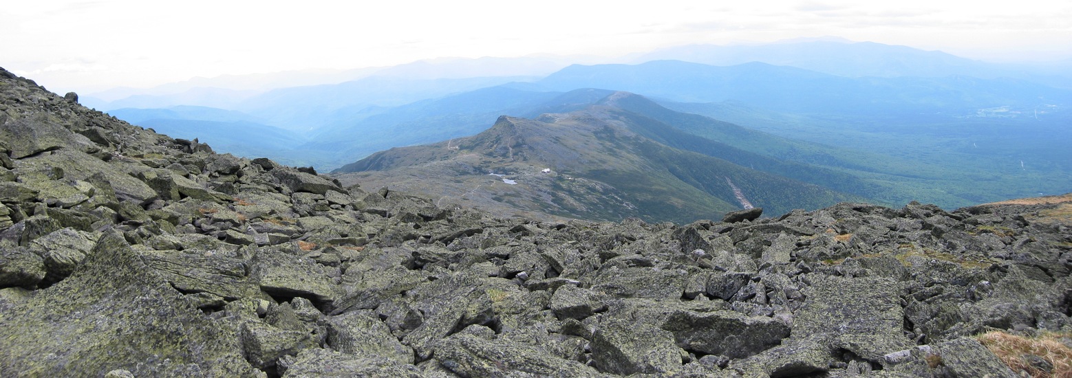 Leaving Mt Washington. Looking toward the southern Presidential range, we can see the Lakes of the Clouds hut and the lakes from here.